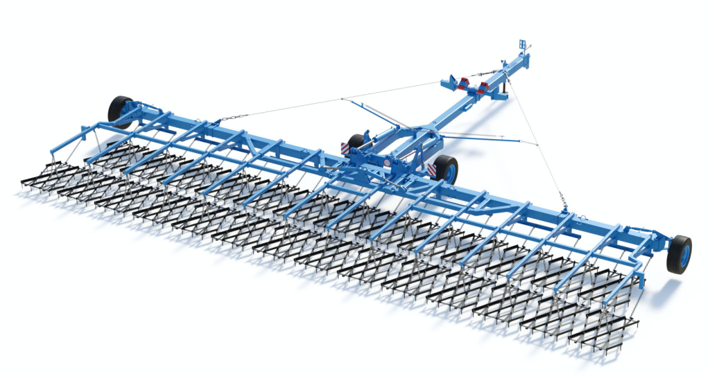 Сцепка зубовых борон гидрофицированная ЗАРЯ СБГ-21-1. Ширина захвата сцепки — 21 м. Производительность 25 гектаров в час.