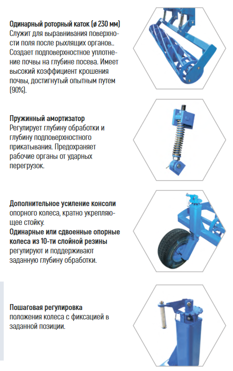 •  выполняют качественную обработку почвы всего за один проход(рыхление, вычесывание сорняков, выравнивание, создание семянного ложа, предпосевное прикатывание, мульчирование).