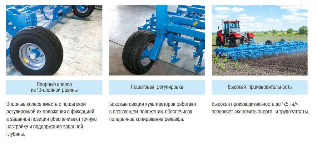 •    Одинарные или парные опорные колеса. Регулировка и стабильное поддержание глубины почвообработки обеспечивается продуманной работой опорных колес.