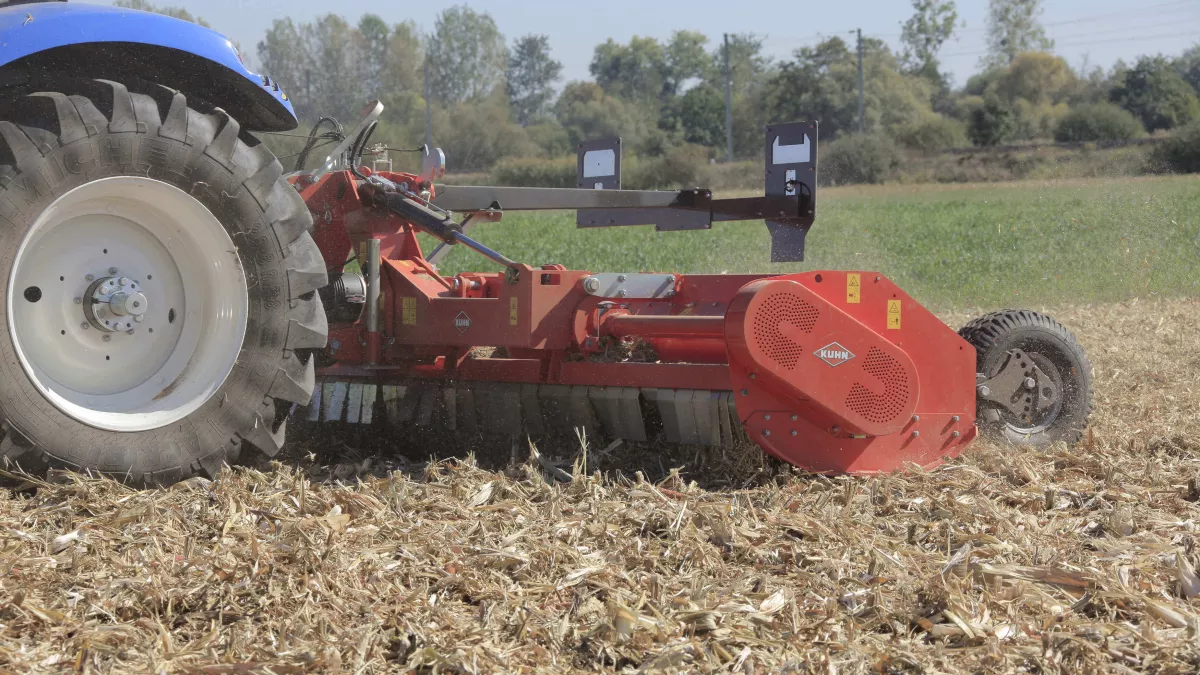 Чтобы сократить центральную полосу, мы оптимизировали всасывание в центре машины. Пожнивные остатки поступают в один из блоков мульчирователя, оснащенных большим количеством рабочих органов в центральной части. Также предусмотрен сошник делителя. В качестве дополнительного оборудования между двумя блоками можно установить диск с гидравлическим управлением, чтобы полностью удалить полосу пожнивных остатков в промежуточных зонах.